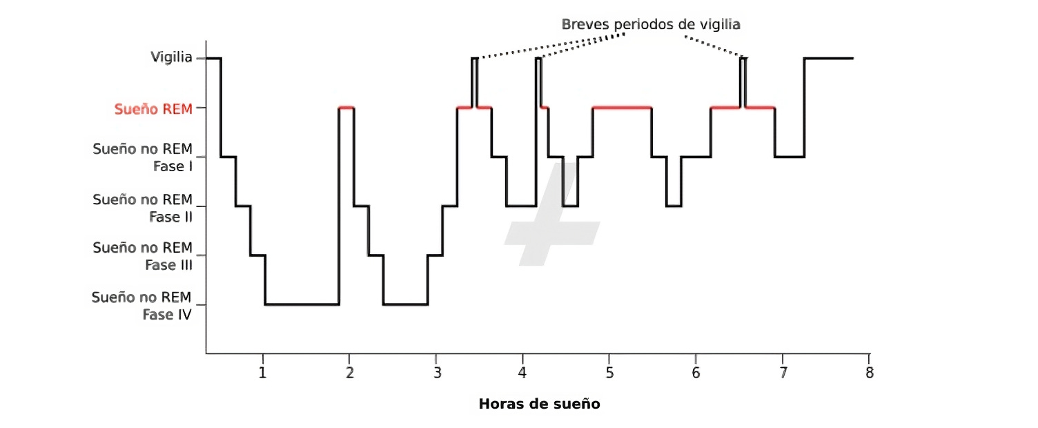 El sueño está programado según fases que se repiten como un ciclo. En el siguiente gráfico puedes ver un hipnograma.